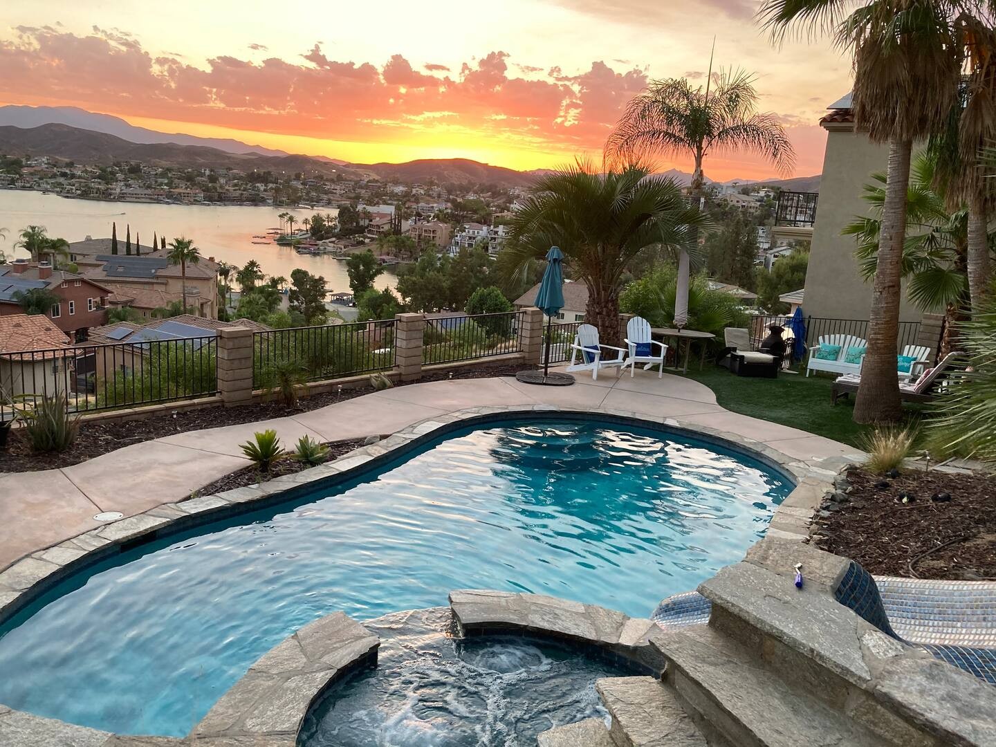 Canyon Lake CA home - just minutes from local vineyards and premier golf courses. This private pool retreat offers 360° mountain views, unforgettable sunsets, and warm, breezy days that melt into star-filled nights. Perfect for groups, this unique home comfortably accommodates up to 20 guests for an unforgettable getaway.