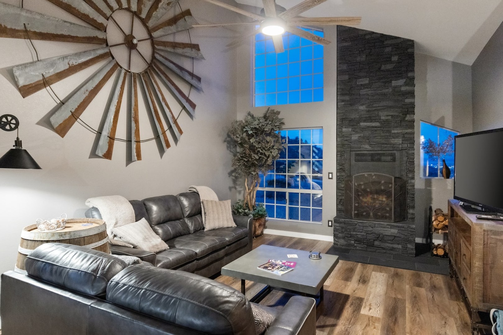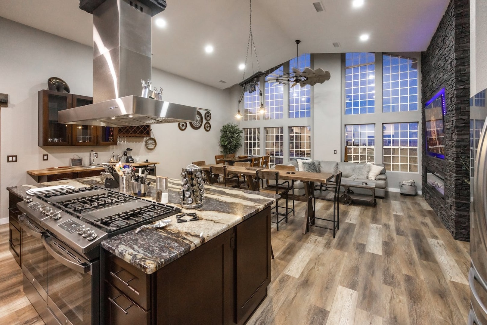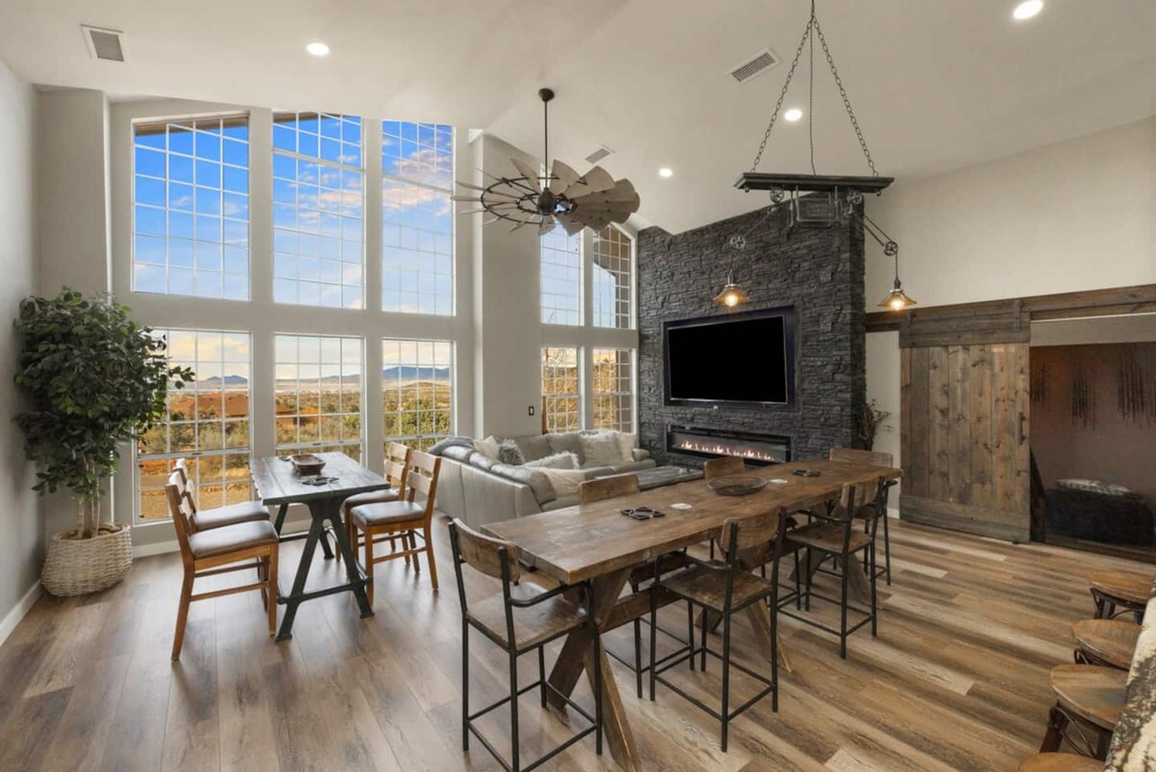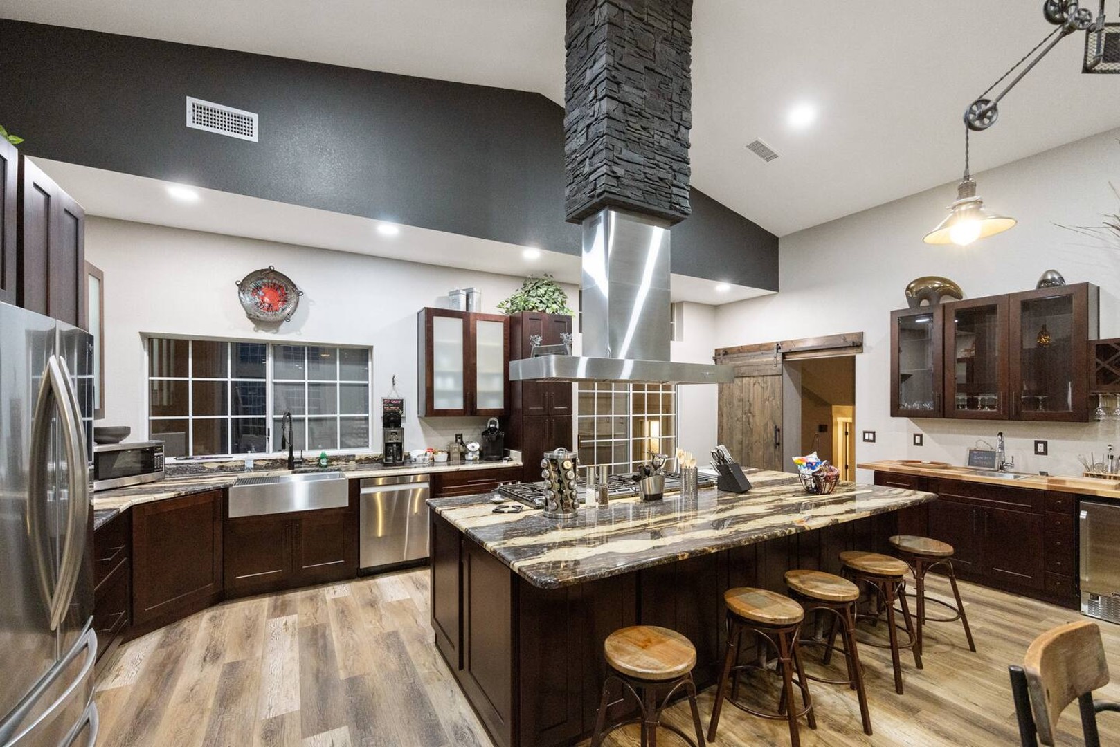 This 4,000+ sq. ft. hillside retreat sleeps up to 22 guests, offering 3 spacious living rooms, a game room, firepit, outdoor café seating, a brand-new hot tub, and even horse stalls!