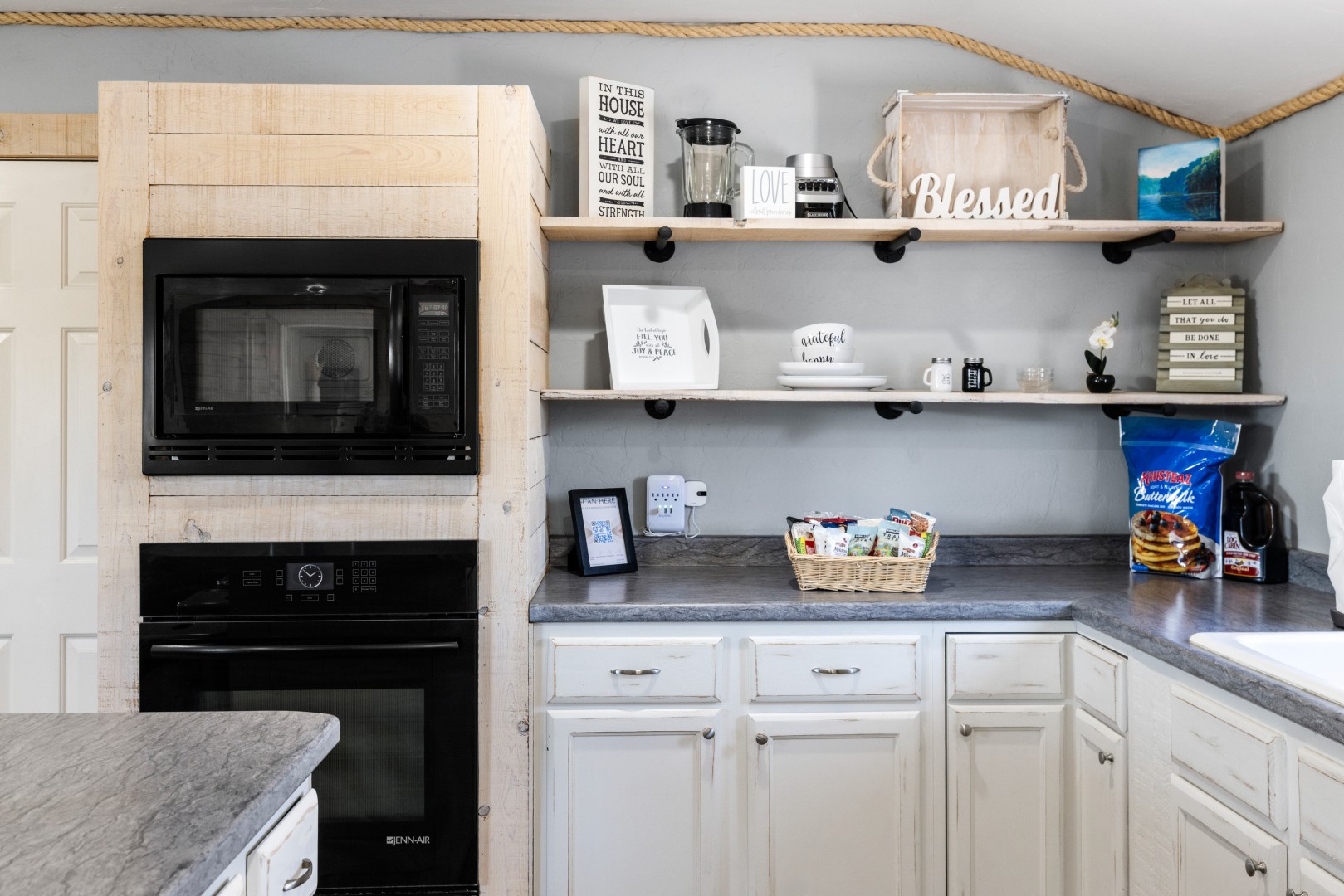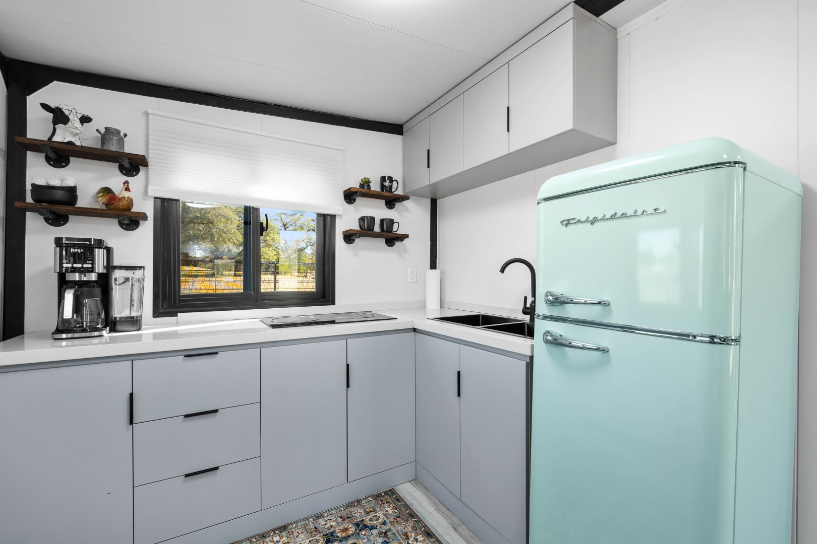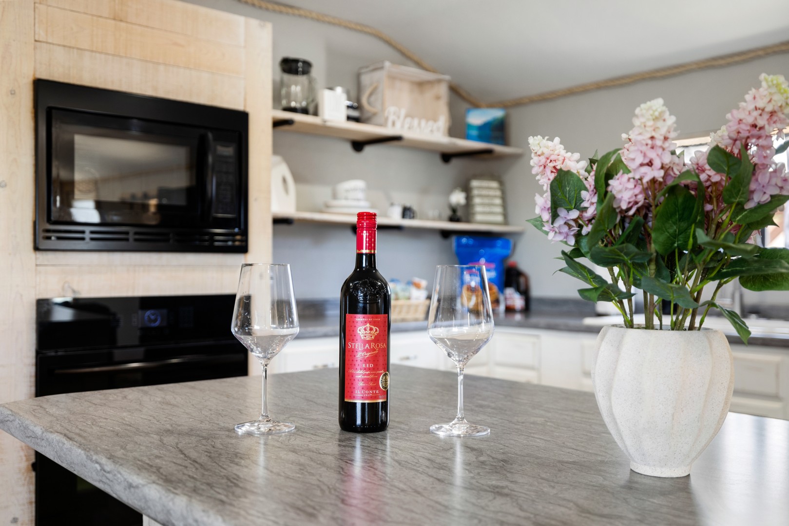 All properties have kitchen facilities. The Cottage kitchen includes a portable two-burner hot plate stored in a cabinet, as there is no built-in stovetop.